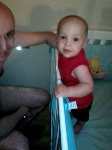 Laura che faccia da furbetto che ha il tuo cucciolo! Sta già in piedi?! Grazie per chiedere sempre di noi! Diego sta bene anche se non so come ha fatto ma si è beccato il raffreddore, cresce tanto e anche se lentamente sta iniziando ad avere più equilibrio e quando si sente sicuro si tira su è prova a fare dei passetti (accompagnato ovviamente) speriamo che il 17 non occorra la visita! Io sto bene anche se sono fisicamente provata dal caldo e le altre cose, il mare ci piace ma..che stanchezza!!! Un abbraccio